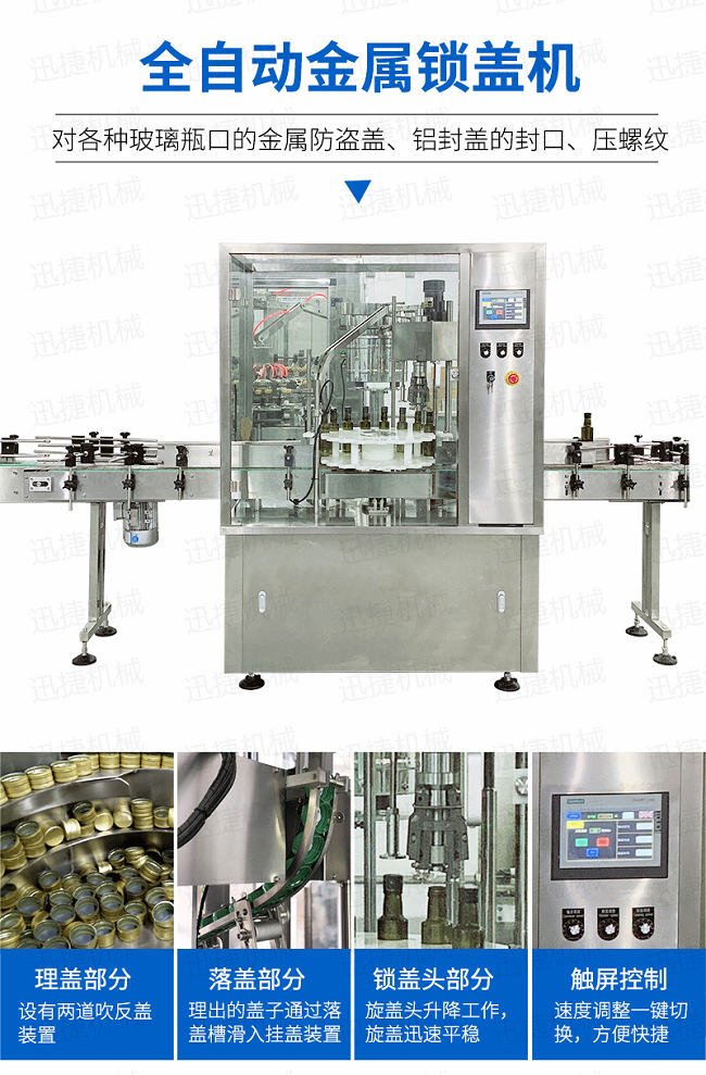 本設(shè)備適用于食品、化妝品、化工等行業(yè),主要針對(duì)各種玻璃瓶口的金屬防盜蓋鋁封蓋的封口、壓螺紋等。該設(shè)備可單機(jī)使用,也可以與灌裝機(jī)等設(shè)備組成生產(chǎn)流水線自動(dòng)作業(yè);