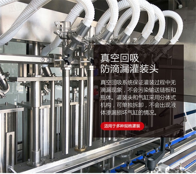 1.真空回吸系統保證灌裝過程中無滴漏現象,不會污染輸送鏈板和瓶體。灌裝頭和氣缸采用分體式機構,可單獨拆卸,不會出現液體滲漏損壞氣缸的情況。進口亞德客氣缸經久耐用,其他密封等配件使用標準件,更換維護簡單方便。