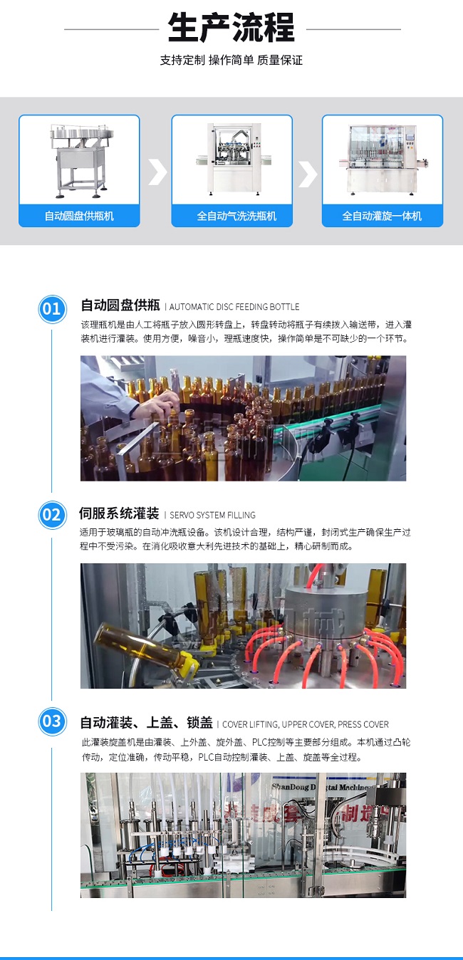 本灌裝流水線設(shè)備具有穩(wěn)定可靠、自動化水平高,相比同類產(chǎn)品有著更長的使用年限,維護簡單,整線中各設(shè)備的協(xié)調(diào)性、連貫性強,整線設(shè)計合理等特點。灌裝設(shè)備采用系統(tǒng)結(jié)構(gòu),為當(dāng)今行業(yè)內(nèi)水平,整線滿足量產(chǎn)化、集成化生產(chǎn)的需要。