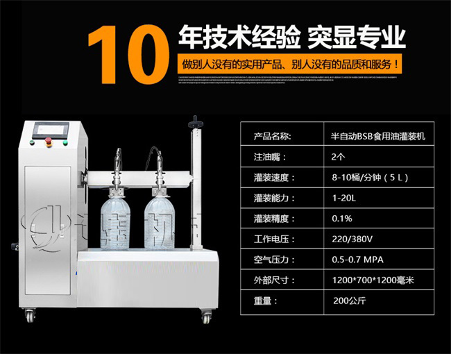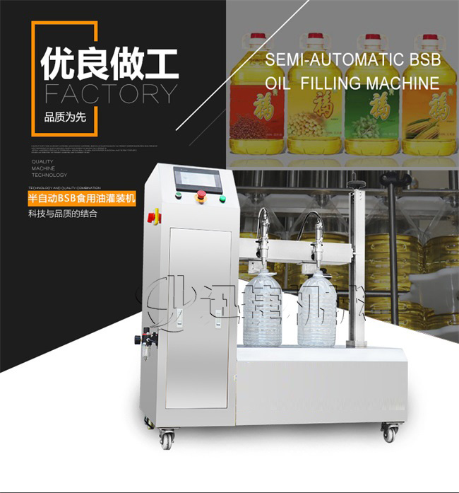 本機適用于花生油、大豆油、菜籽油、色拉油、芝麻油、石油化工潤滑油等各種油類和粘稠液體的定量要求。半自動雙頭電動BSB食用油灌裝機:采用的微電腦技術,自備動力,管路無需加壓,節約運行成本;自動檢測油浙、自動修正溫度變化引起的密度變化,適合大溫差環境的油品灌裝工作,使用方便靈活;機電一體化設計,安裝方便,整機價格低廉。