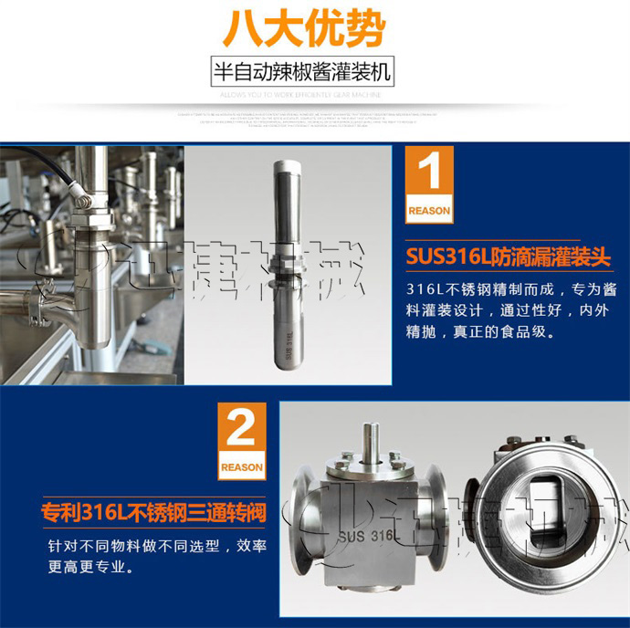 半自動辣椒醬灌裝機適合于將各類粘稠體及含有各種固體物質如辣椒、花生、肉塊、佐料等物體的醬類和油、料分離的火鍋底料等灌裝于各種容器中,適用于辣椒醬、顆粒醬料、大塊肉醬、火鍋底料等醬體的灌裝。