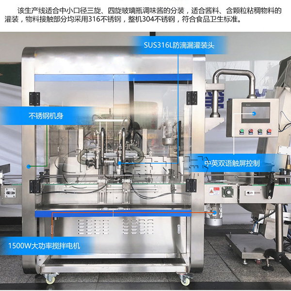 1、該機為全自動醬類灌裝機,配有自動攪拌功能,使物料混合更加均勻 ,有效的解決灌裝誤差大的問題;